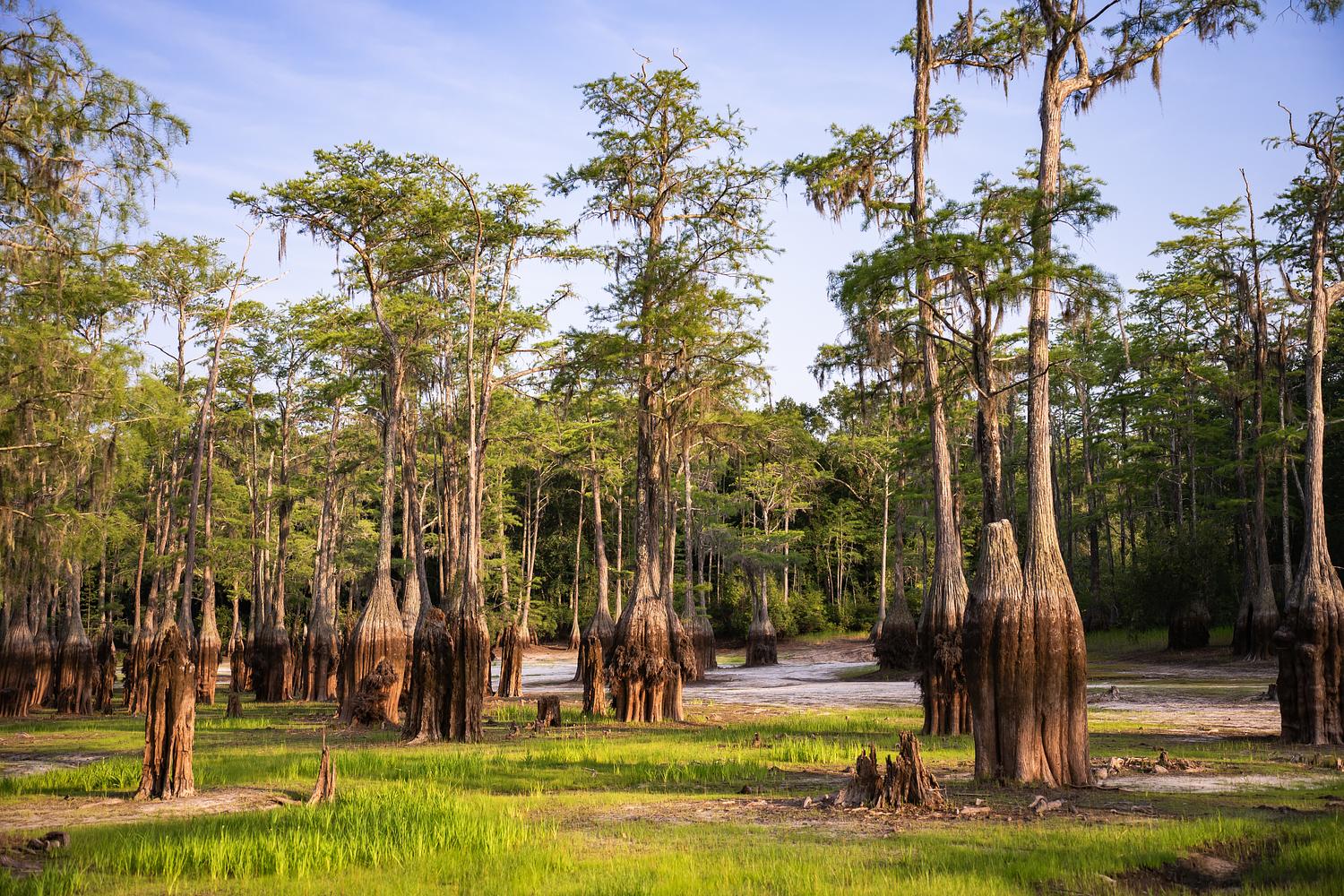 Cascade Lake in Tallahassee had a natural drawdown in the summer of 2023, revealing the large roots of cypress trees that normally reside underwater.